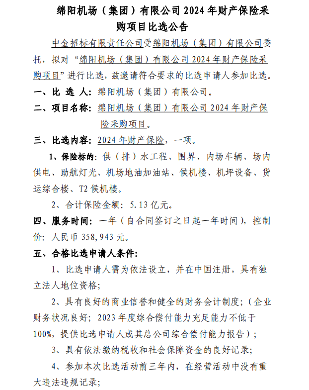 綿陽機(jī)場(chǎng)(集團(tuán))有限公司2024年財(cái)產(chǎn)保險(xiǎn)采購項(xiàng)目比選公告