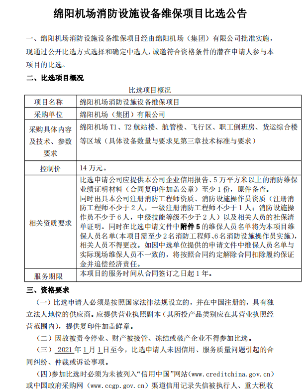 綿陽(yáng)機(jī)場(chǎng)消防設(shè)施設(shè)備維保項(xiàng)目比選公告
