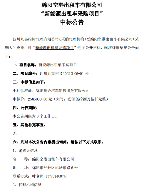 綿陽(yáng)空港出租車有限公司 “新能源出租車采購(gòu)項(xiàng)目” 中標(biāo)公告