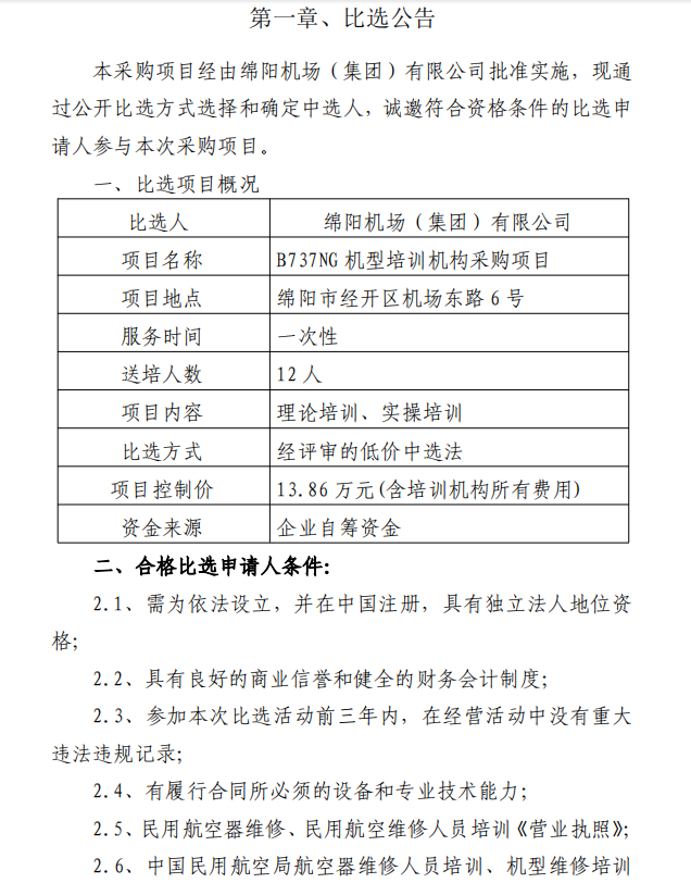 綿陽機場B737NG機型培訓機構采購項目比選公告
