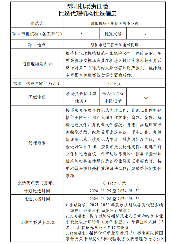 綿陽機場責任險 比選代理機構(gòu)比選信息