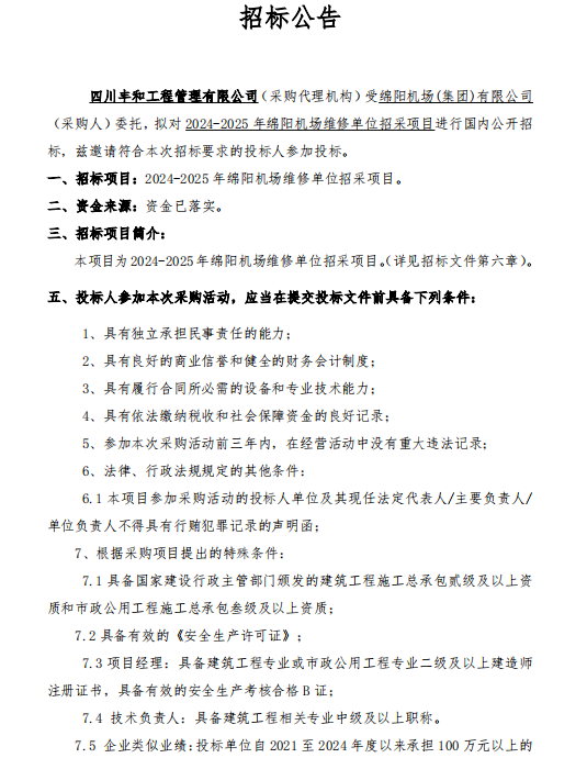 2024-2025年綿陽(yáng)機(jī)場(chǎng)維修單位招采項(xiàng)目招標(biāo)公告